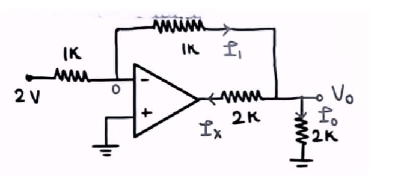 Question 2: In the given op-amp circuit, the non-inverting terminal is grounded. The input voltage is 2 V applied through 1kΩ. The feedback resistor is 1kΩ. The output is connected to a 2kΩ load to ground and also through a 2kΩ resistor to the op-amp output. Find the output voltage V0 and currents I1,I0, and Ix.