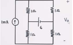 Question 1: In the given circuit, all resistors are $1 \mathrm{k} \Omega$. A 1 mA current source is connected between the top and bottom nodes. A 6 V source connects the midpoints of the two vertical branches as shown. Find the output voltage $V_0$.