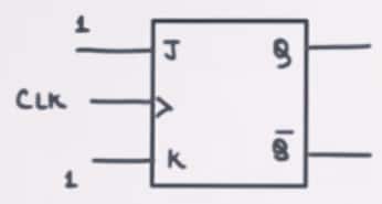 Question 6: A JK flip-flop has inputs $J=1$ and $K=1$. The clock input is applied as shown. Find the output clock cycles per second (output frequency).