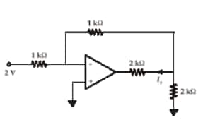 Question 2: In the given op-amp circuit, the non-inverting terminal is grounded. The input voltage is 2 V applied through $1 \mathrm{k} \Omega$. The feedback resistor is $1 \mathrm{k} \Omega$. The output is connected to a $2 \mathrm{k} \Omega$ load to ground and also through a $\mathbf{2} \mathbf{k} \Omega$ resistor to the op-amp output. Find the output voltage $V_0$ and currents $I_1, I_0$, and $I_x$.