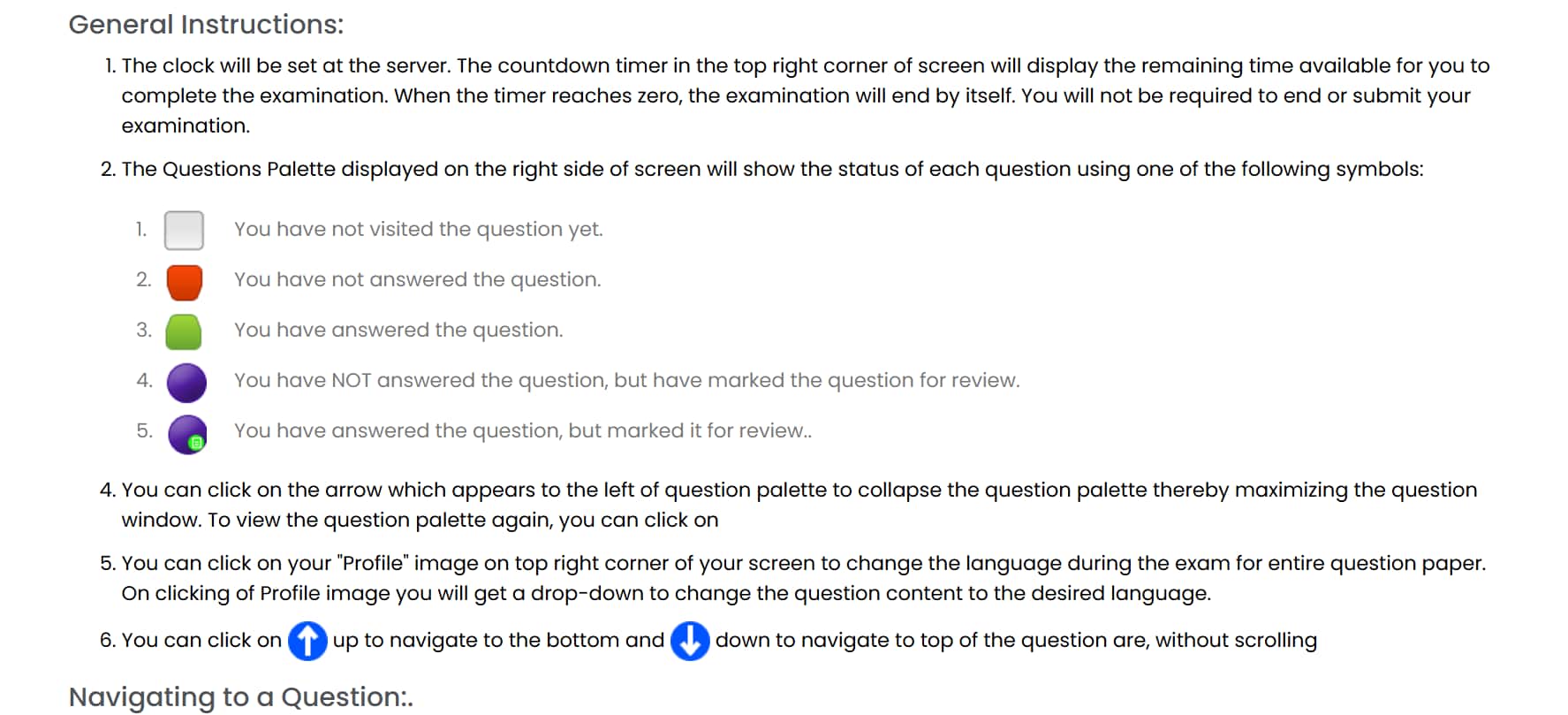 Purple with a green circle | The candidate has answered the question but marked it for review. |