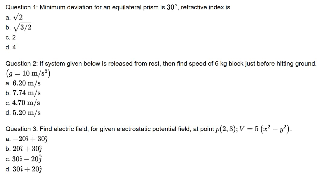 Question 1: Minimum deviation for an equilateral prism is $30^{\circ}$, refractive index is