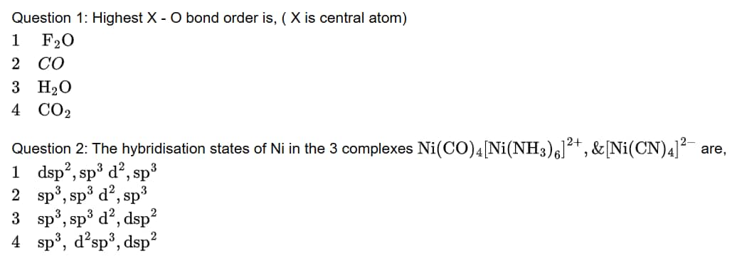 Question 2: The hybridisation states of Ni in the 3 complexes $\mathrm{Ni}(\mathrm{CO})_4\left[\mathrm{Ni}\left(\mathrm{NH}_3\right)_6\right]^{2+}, \&\left[\mathrm{Ni}(\mathrm{CN})_4\right]^{2-}$ are,