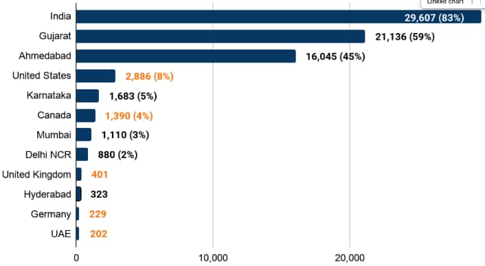 This graph represents the alumni distribution all around the country and world.. 83 per cent of the Nirma alumni are working in India, and the remaining 17 per cent of the alumni are working all around the world, with 1,390 alumni working in Canada, 401 alumni working in the UK, 229 alumni working in Germany, and 202 alumni have a presence in UAE.