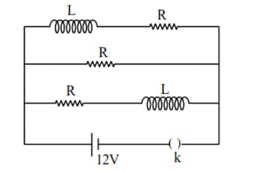 Three identical resistors with resistance $\mathrm{R}=12 \Omega$ and two identical inductors with self inductance $\mathrm{L}=5 \mathrm{mH}$ are connected to an ideal battery with emf of $