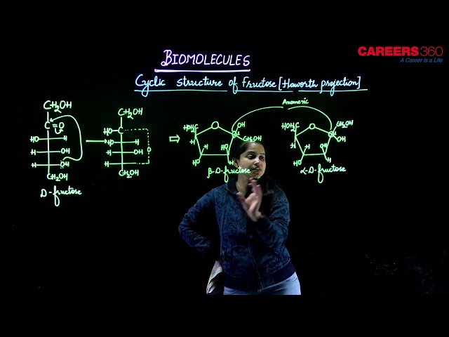 It also exists in two cyclic forms which are obtained by the addition of —OH at C5 to the (C=O) group. The ring, thus formed is a five-membered ring and is named as furanose with analogy to the compound furan. Furan is a five-membered cyclic compound with one oxygen and four carbon atoms. The cyclic structures of two anomers of fructose are represented by Haworth structures as given below.