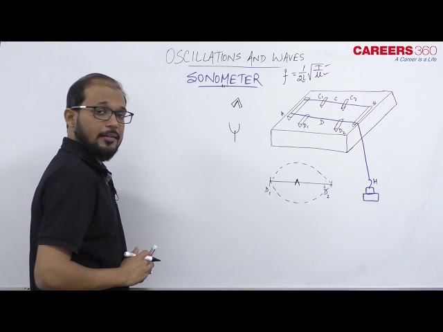 The principle of sonometer is based on the resonance of string vibrations. Working oscillations are induced in a clamped string by an external source like a tuning fork or an oscillator and because of this, the amplitude becomes very high when resonance takes place.