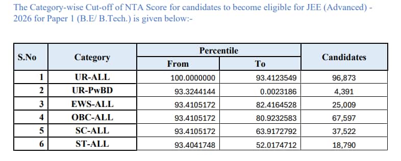 राष्ट्रीय परीक्षा एजेंसी आधिकारिक वेबसाइट jeemain.nta.nic.in पर सामान्य के लिए जेईई मेन 2026 कटऑफ प्रकाशित करेगी। एनटीए क्वालीफाइंग परसेंटाइल के निर्धारण के लिए जिम्मेदार है जो उम्मीदवारों को जेईई एडवांस लेने में सक्षम बनाएगा। जबकि, जोसा कॉलेज प्रवेश के लिए जेईई मेन कटऑफ प्रदान करता है। प्राधिकरण जेईई मेन कटऑफ श्रेणी-वार जारी करता है।